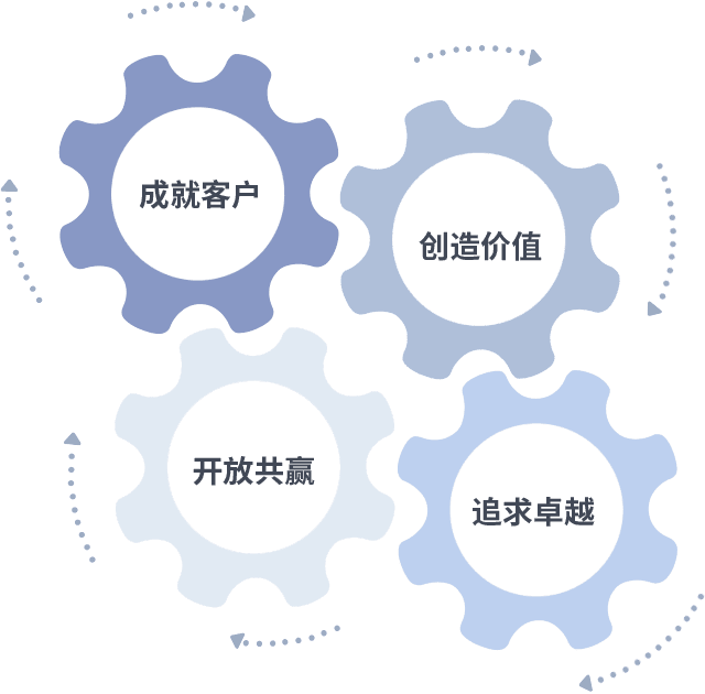 成就客户是一切决策的出发点,,,创造价值是衡量所有工作的标准,,,,追求卓越是我们做事做人的态度,,,,开放共赢是我们的格局也是最终的结果。。。。价值观的齿轮环环相扣,,,,推动着组织里的每个人不断向前。。。